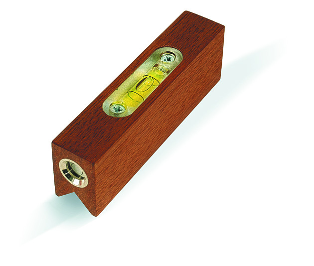 Nivelle en acajou avec nivelles longitudinales et frontales intégrées.