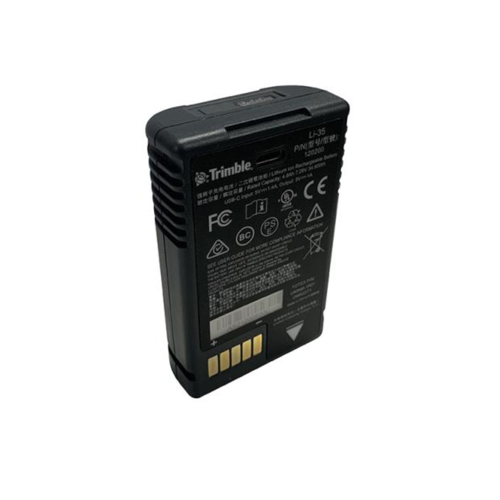 Der Li-35 ist ein Lithium-Ionen-Akku mit 34,85 Wh (7,26 V / 4800 mAh) für Trimble-Controller. Er verfügt über einen erweiterten Kontaktstecker mit „Presence“-Kontakt für sicheren Sitz und einen USB-C-Anschluss zum Laden im Gerät oder extern. Weisse LED-Indikatoren zeigen Lade- und Akkustand. In Kombination mit dem internen Controller-Akku verdoppelt sich die Betriebszeit.